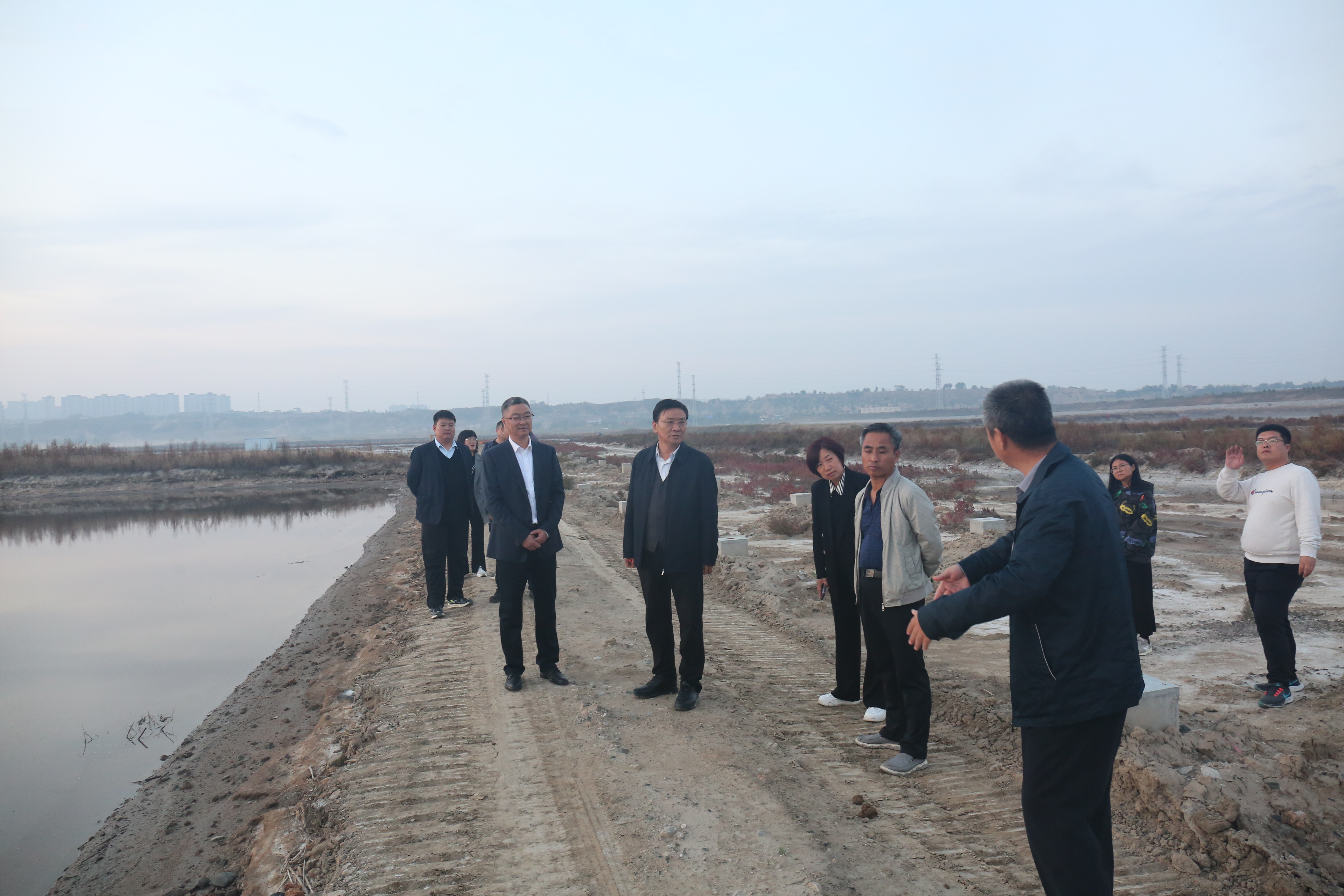 公司領(lǐng)導(dǎo)調(diào)研鹽湖堤埝治理項(xiàng)目(一期)木棧道施工現(xiàn)場(chǎng)